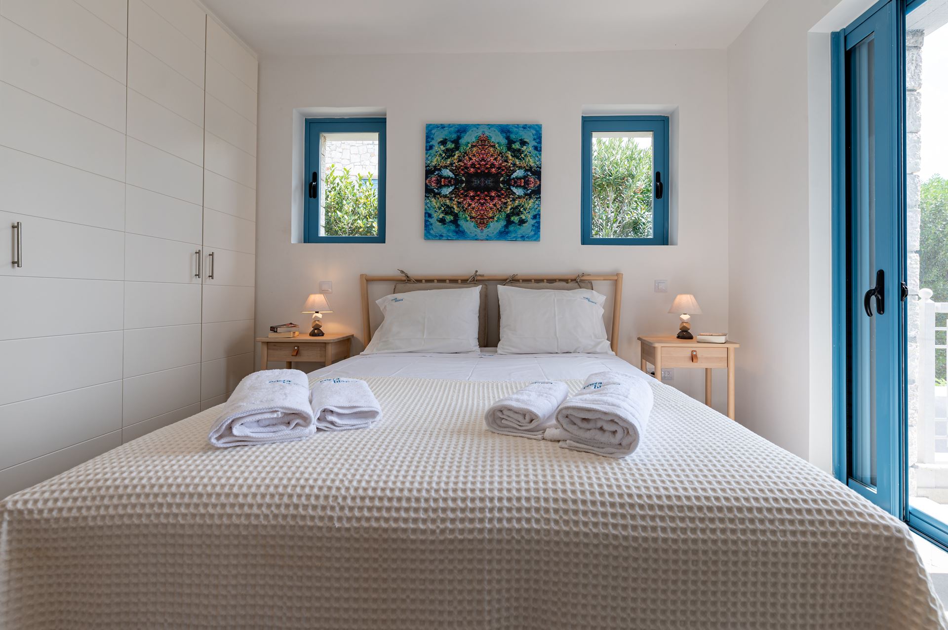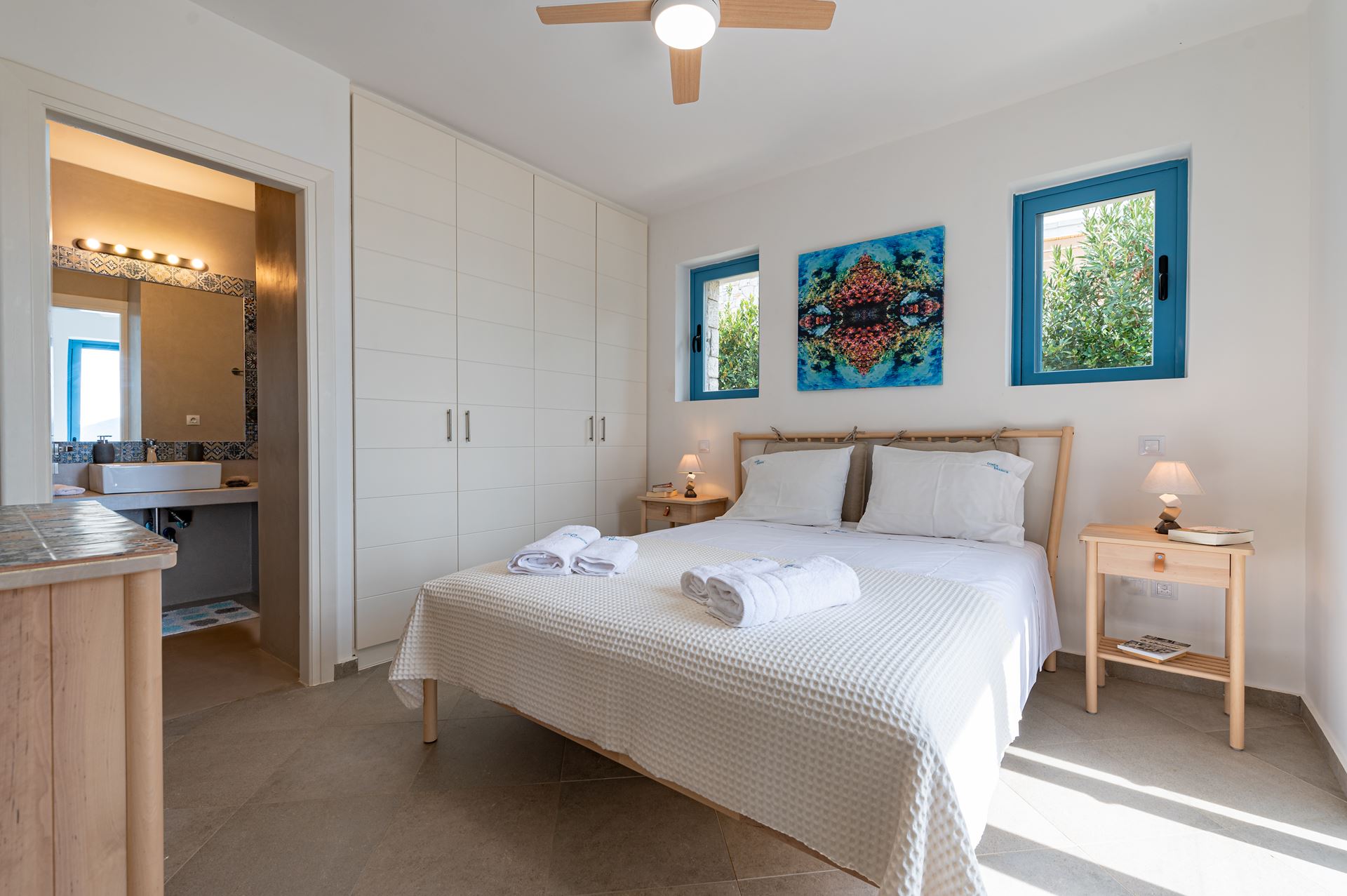 Villa Aubrieta offers a spacious living room and a fully equipped kitchen on the ground floor, along with a bedroom and bathroom ensuite, that features beautiful views of the garden and the pool, extending to the sea and stunning sunsets. The lower floor hosts two additional bedrooms, each one with private bathroom. Finally, two additional beds are available in the attic which is open to the living room nad completes the charming ambiance, comfortably accommodating up to 9 guests.
