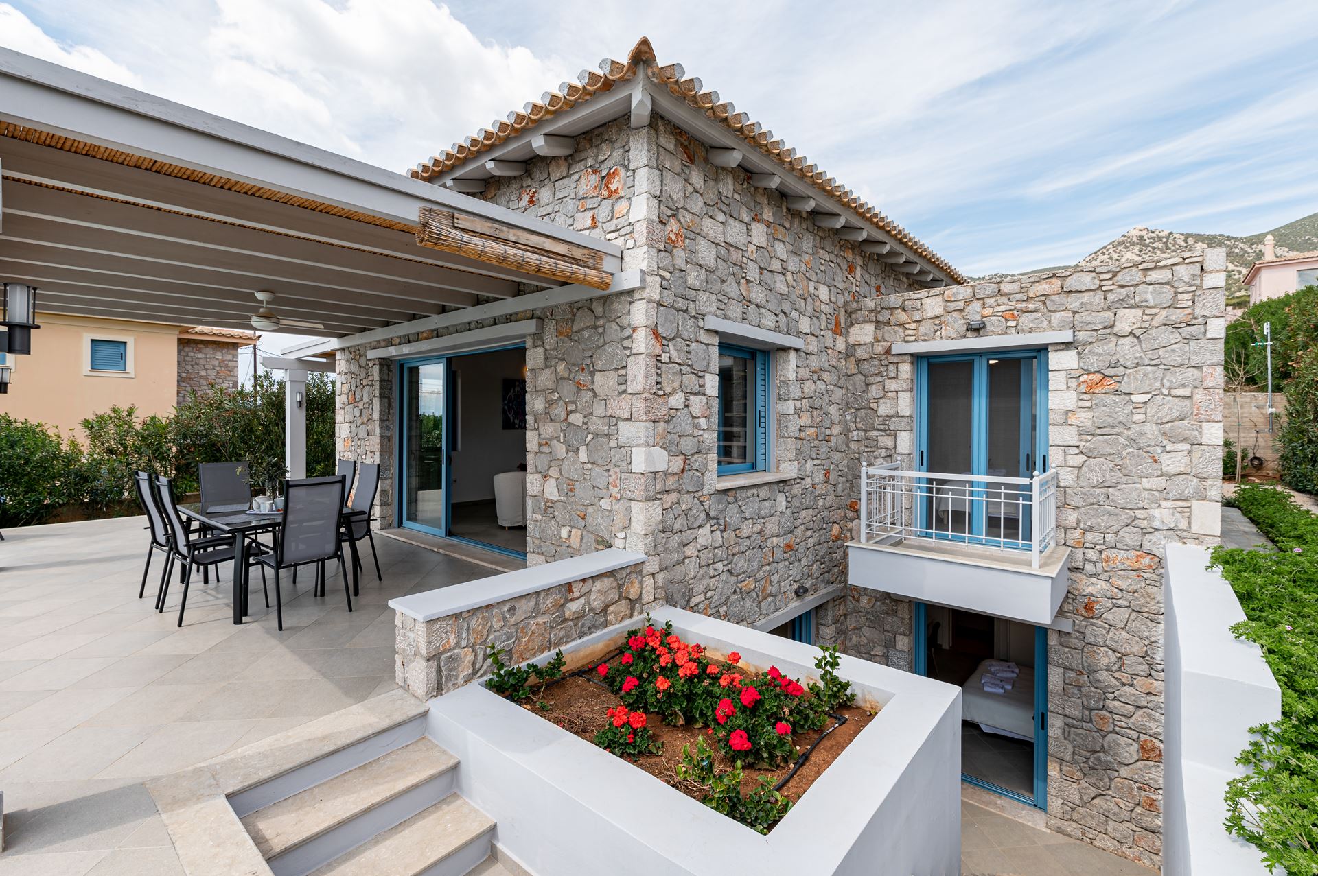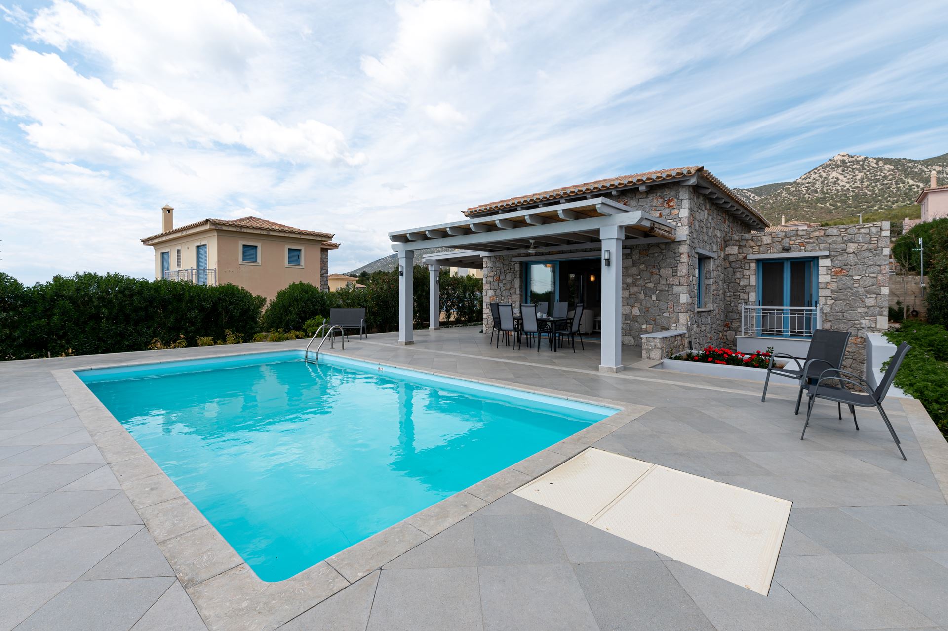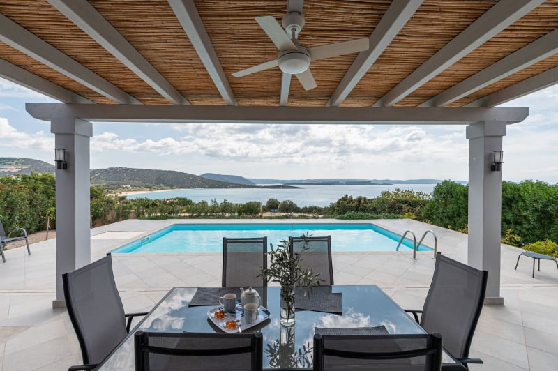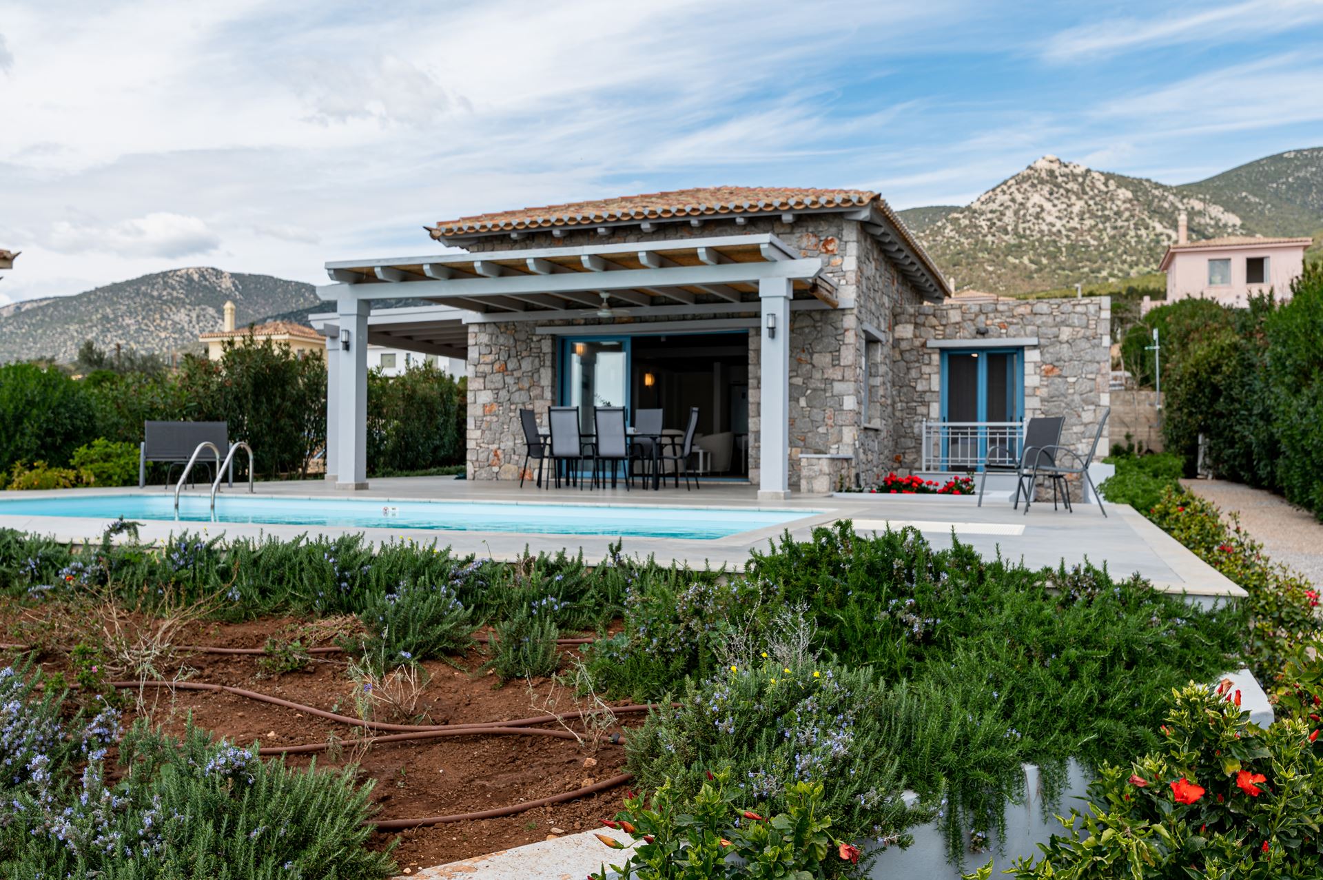 The lush garden surrounds a generous pool area with sun loungers and parasols, ideal for relaxation or sunbathing (Sunbeds are provided around the pool). An outdoor dining area overlooking the sea provides the perfect backdrop for memorable meals and sunset views, making Aubrieta an ideal spot for friends and couples seeking a delightful escape.